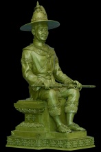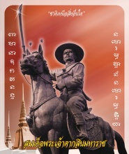 ๒ พระบรมรูปเจ้าตากลอยองค์แบบยืนบัญชาการทัพ เนื้อนวะโลหะหล่อโบราณ บูชาองค์ละ ๑,๐๐๐ บาท, เนื้อทองแดงรมดำบูชาองค์ละ ๕๐๐ บาท, เนื้อเงินหมดแล้ว (ทุกองค์ตอกโค๊ตอุดผง)