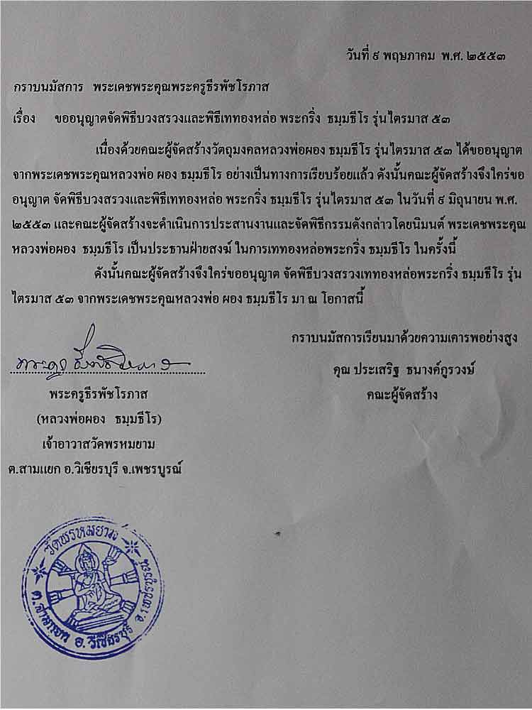 วัตถุมงคล หลวงพ่อผอง รุ่น ไตรมาส ๕๓ นี้