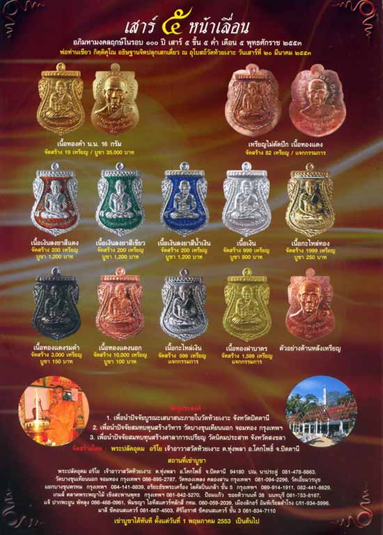 ราคาเหรียญละ 120 บาท ค่าจัดส่ง 50 บาท ต่อ รายการครับ สนใจ รีบโทร 0840680188 พจนันท์ ครับ ช้าหมดอดแน่ครับ พิธีเสาร์5 ของวัดห้วยเงาะ |