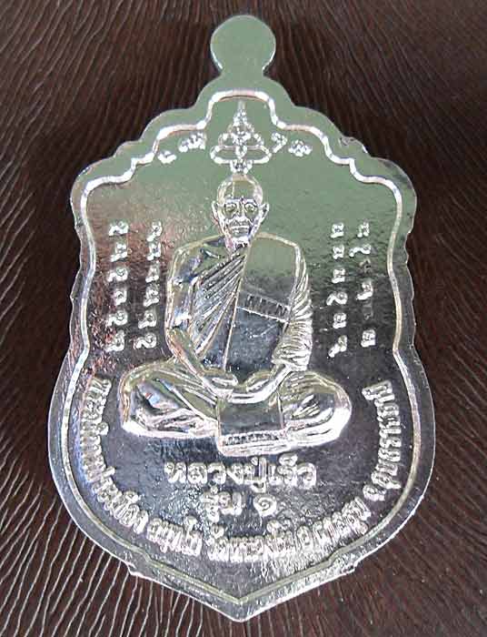 ด้านหลังเป็นรูปหลวงปู่เร็วนั่งเต็มองค์ มียันต์แก้วสารพัดนึกอยู่สองข้าง
