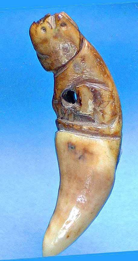 ไม่ทราบอาจารย์ท่านใดสร้างครับ ทราบแต่ว่าเป็นเขี้ยวเสือแท้แน่นอน (เพราะว่ามีทางรอยร่องเลือด...ยาวลงมาตามเขี้ยว) ...บริเวณข้างหัวเข่ามีจาร (ตัว อุ) และอีกด้านก็มีจาร ฯ