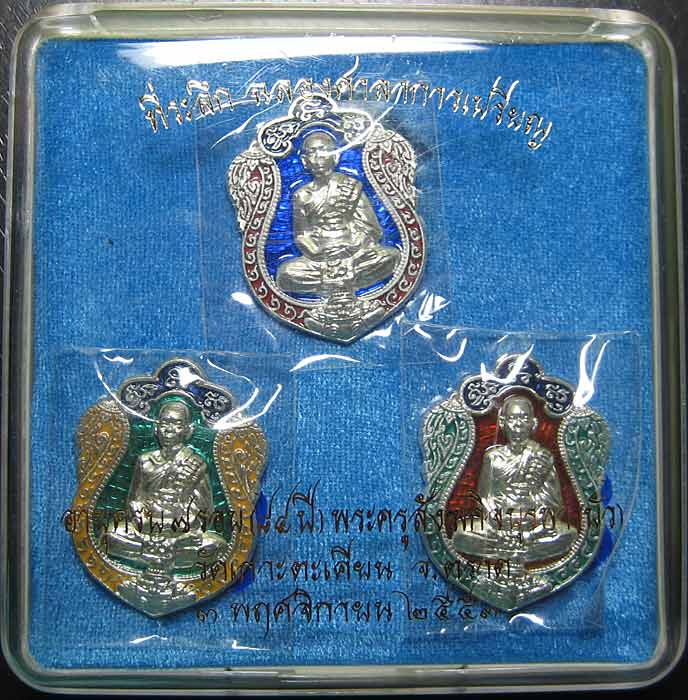 ชุดเนื้อเงิน องค์หลวงปู่ไม่ลงยา ด้านบนลงยาสีม่วง องค์หลวงปู่เงิน (3 เหรียญ) สร้างทั้งหมด 150 ชุด ประกอบด้วย
