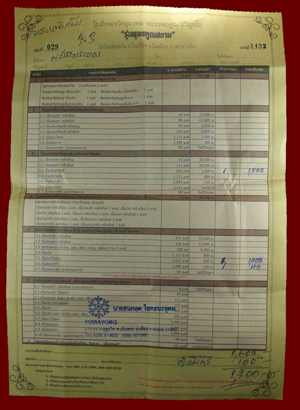 ขายใบจองพระหลวงพ่อคุณ รุ่น พุทธคุณสยาม รวมทั้งหมด 4 เหรียญ ดังนี้ 1.เหรียญปั๊มรูปเหมือน นั่งฐานสิงห์ พิมพ์เตารีดเล็ก ( 1. เนื้อเงินบริสุทธิ์ 1 เหรียญ สร้าง 555 องค์ ) 2.เหรียญพิมพ์เม็ดแตง เลี่อมสมณศักดิ์ ( เทพวิทยาคม ) คูณ เต็มองค์รุ่นแรก ( เนื้อนวะ 2 เหรียญ สร้าง 2,222 องค์ ) ( เนื้ออัลปก้า 1 เหรียญ สร้าง 2,999 องค์ ) รวมทั้งหมด 4 เหรียญ ( 3,300 บาท ทั้งชุด ) |