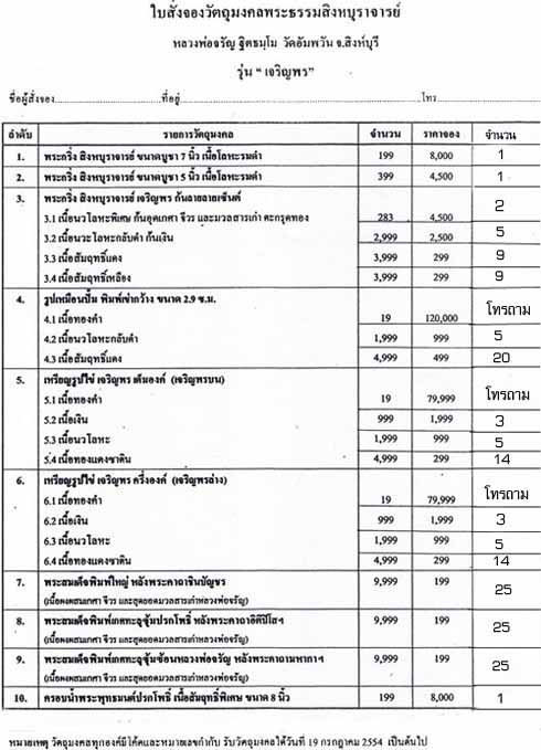 1.พระบูชารูปเหมือนหลวงพ่อจรัญ ไฟเบอร์กลาส เหมือนองค์จริง จำนวนสร้าง 599 บูชา 9,999 บาท มี 1 องค์