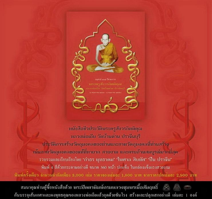 ขอเชิญเพื่อนพ้องน้องพี่ที่เคารพและศรัทธาในหลวงพ่อเอีย วัดบ้านด่าน จ.ปราจีนบุรี รวมถึงนักนิยมสะสมวัตถุมงคลทุกท่าน ร่วมสั่งจองหนังสือวีวประวัติพระครูสังวรกิตติคุณ หรือหลวงพ่อเอีย วัดบ้านด่าน จ.ปราจีนบุรี