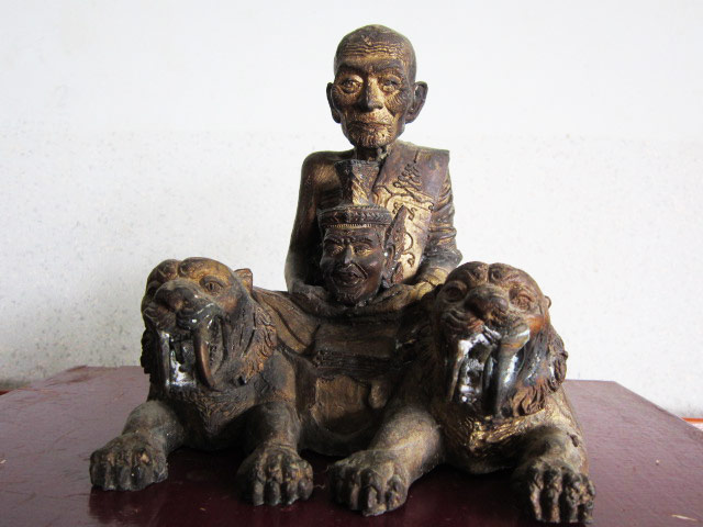 พระบูชาหลวงปู่กาหลง เขี้ยวแก้ว รุ่นแรก หน้าตักขนาด 5 นิ้ว นั่งเสือคู่อุ้มเศียรปู่สิงห์สมิงพราย ใต้ฐานบรรจุตะกรุด มวลสารศักดิ์สิทธิ์