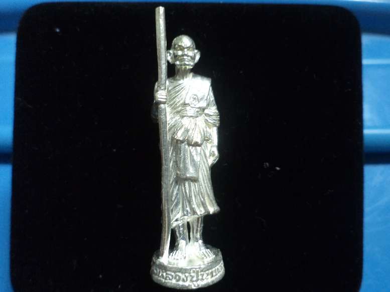 รูปหล่อยืนถือไม้เท้าครูรุ่นแรก เนื้อเงิน หลวงปู่นาม วัดน้อยชมภู่ครับ