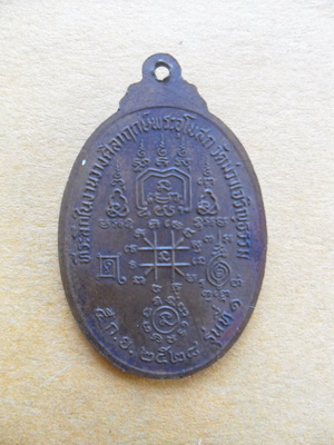 ด้านหลังเหรียญ เขียนข้อความรอบเหรียญด้านนอก ว่า "ที่ระลึกในงานวางศิลาฤกษ์พระอุโบสถวัดม่วงเจริญธรรม ๕ ก.ย. ๒๕๒๘ รุ่นที่ ๑" ตรงกลางเป็นยันต์มหาโภคทรัพย์ เหรียญหลวงพ่อเกษม รุ่น 1 มีพุทธคุณโดดเด่นเข้มขลัง เชื่อกันในหมู่นักสะสมว่า ใครที่ได้บูชาเหรียญรุ่นนี้ จะมีโชคลาภ เมตตามหานิยม ค้าขายดี เดินทางปลอดภัย สมดั่งพรที่หลวงพ่อเกษม เขียนไว้ที่ด้านหน้าเหรียญรุ่นนี้