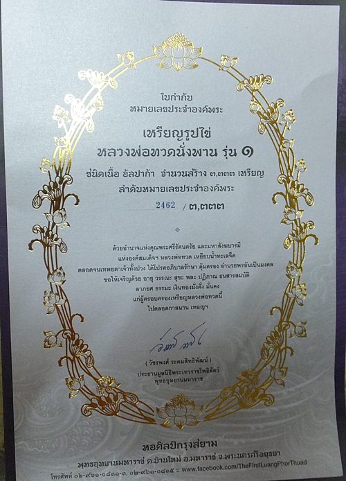ใบกำกับหมายเลขประจำองค์พระ รูปไข่ เนื้ออัลปาก้า