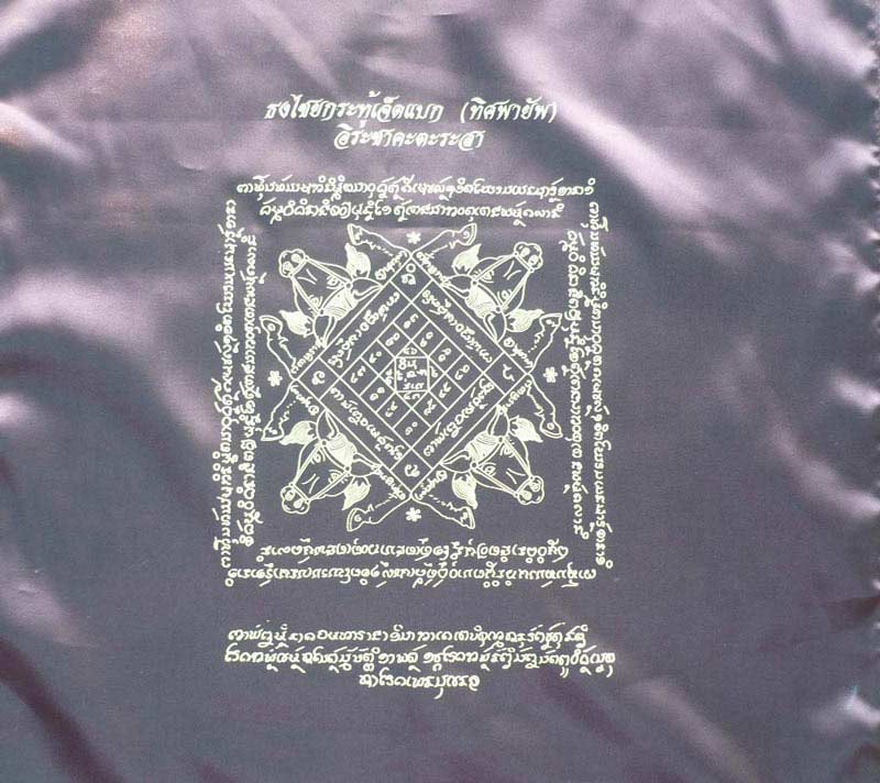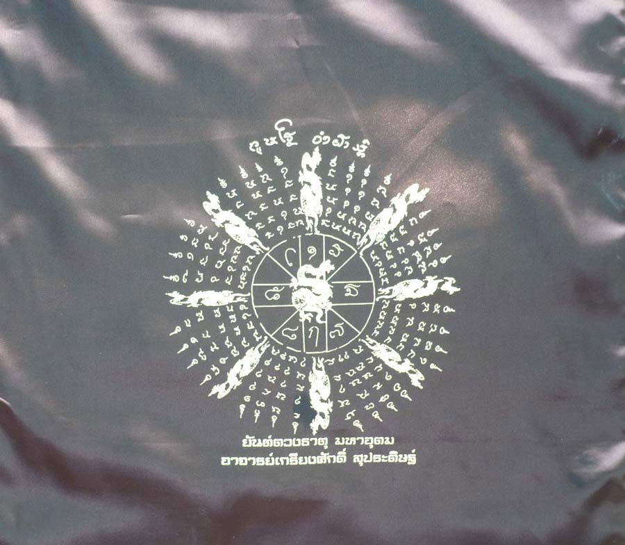 เป็นผ้ายันต์กลับดวง ต่ออายุ หนุนชะตา เสริมบารมี เป็นผ้ายันต์ที่รับพลังเทพ ใช้ในงานไหว้ครูของอาจารย์ เกรียงศักดิ์ สุประดิษฐ์ (ในวันที่ 2 ก.พ. ที่ผ่านมา) ผู้ที่ใกล้ชิดหลวงปู่และเป็นพราหมณ์ที่สร้างวัตถุมงคลถวายหลวงปู่ญาท่านสวน ตั้งแต่ ปี ๓๙จนถึงปี ๔๘ เป็นผู้สร้างมีดสายฟ้าปราบมหาไตรจักรของหลวงปู่ญาท่านสวน ฉนฺทโร เป็นเครื่องรางที่ได้รับความนิยมมากที่สุดในบรรดาเครื่องรางของท่าน ด้วยพิธีการ มวลสาร ฤกษ์ยาม และใช้ช่างแกะลายใบมีดจากนครสวรรค์ ที่แกะใบมีดหลวงพ่อเดิม วัดหนองโพธิ์ และยังสามารถดึงสายฟ้ามาล้างใบมีดในเวลากลางวันในหลายๆครั้งอย่างไม่ผิดพลาด และในช่วงตอนค่ำก็ยังนำชุดใบมีดดังกล่าวอาบแสงจันทร์ ขนาด 45 cm.x 149 cm. จำนวนสร้างเพียง 64 ผืนเท่านั้นครับ ออกแบบโดยพราหมณ์หลวงในวัง พุทธคุณเด่นด้านมหาเมตตา มหาโภคทรัพย์ มาพร้อมเสื้อที่ระลึกที่ด้านหลังเป็นลายมือหลวงปู่ญาท่านสวน ที่ท่านเขียนไว้ในสมุดข่อย อาจารย์เกรียงศักดิ์ได้อัญเชิญมาไว้ที่เสื้อ เนื่องด้วยเป็ยันต์โบราณที่หายากและมีพุทธคุณด้านเมตตา เสริมบารมี ซึ่งอาจารย์เกรียงศักดิ์เป็นผู้ที่เข้มขลังในวิชายิ่งนัก เป็นผู้สืบทอดวิชาทำน้ำมนต์กลับหม้อจากหลวงปู่แต่เพียงผู้เดียว ครับ