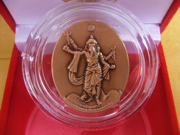 เหรียญพระพิฆเนศวร ปางมหาเทพแห่งศิลปะของแผ่นดิน รุ่นเฉลิมพระเกียรติ ๘๐ พรรษา เนื้อบรอนซ์ ขนาด 2.5x3 ซม. จัดสร้างโดยบริษัท บริษัท เวิร์คพอยท์ เอ็นเทอร์เทนเมนท์ จำกัด (มหาชน) )(คุณปัญญา นิรันด์กุล)