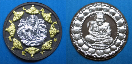 - พระผงว่าน จตุคาม ล้อมรอบด้วยพระราหู หลังหลวงปู่ทวด ขนาด 5.5 ซ.ม. เนื้อดินกากยายักษ์ ปิดเงิน