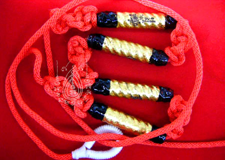 ตะกรุด 4 มหาเทพ หลวงปู่กาหลง เขี้ยวแก้ว รุ่น ขุมทรัพย์เขี้ยวแก้ว ปี 52 ( พระพรหม-มหาเสน่ห์,พระอุมาเทวี-มหาชุมนุม,พระอิศวร-มหาละลวย,พระนารายณ์-มหาจังงัง ) ยาว 2.5 นิ้ว แผ่นตะกั่วจารด้วยมือทั้ง 2 ด้าน ถักเชือกลงรักคลุกผงวิเศษ ลงรักปิดทองคำแท้ มีโค๊ดและหมายเลขกำกับทุกดอก