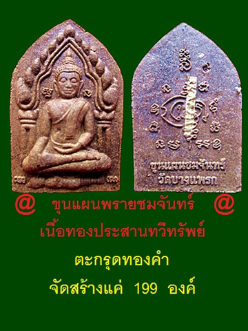 1.พระขุนแผนพรายชมจันทร์ เนื้อทองประสานทวีทรัพย์ หลังยันต์ฝังตะกรุดทองคำ สร้างจำนวน 199 องค์