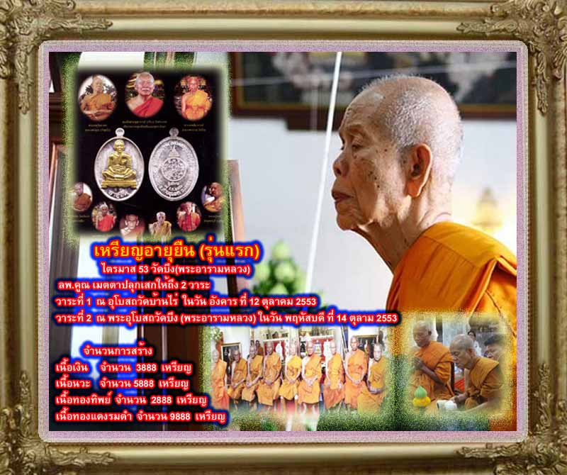 3)เหรียญอายุยืน (นั่งบนตั่งเต็มองค์) เนื้อทองทิพย์ สร้าง 2,888 เหรียญ....ให้บูชา เหรียญละ 650 บาท (มีอยู่ 10 เหรียญ)