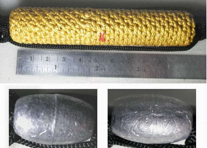 ตะกรุด ๓ กษัตริย์ หลวงพ่อเอื้อน วัดวังแดงใต้ ดอกยาว ๔ นิ้ว หลวงพ่อเอื้อน ท่านเขียนอักขระบนแผ่นโลหะ ๓ แผ่น โดยลงอักขระวิชา โสฬส มหามงคล และมหาอุต ไว้แต่ละแผ่น แล้วม้วนซ้อนกันทั้ง ๓ แผ่น ถักด้วยเชือก แล้วจึงทาด้วยสีทอง จากนั้นนำมาถักสายคาดเอวด้วยเชือก พร้อมกับร้อยลูกสะกดไว้ทั้งสองข้าง มีจารที่ลูกสะกดด้วย...เดี๋ยวนี้หายากแล้วครับที่พระเกจิจะลงอักขระเอง หลวงพ่อเอื้อนท่านบอกอีกไม่นานก็ลงเองไม่ไหวแล้ว...