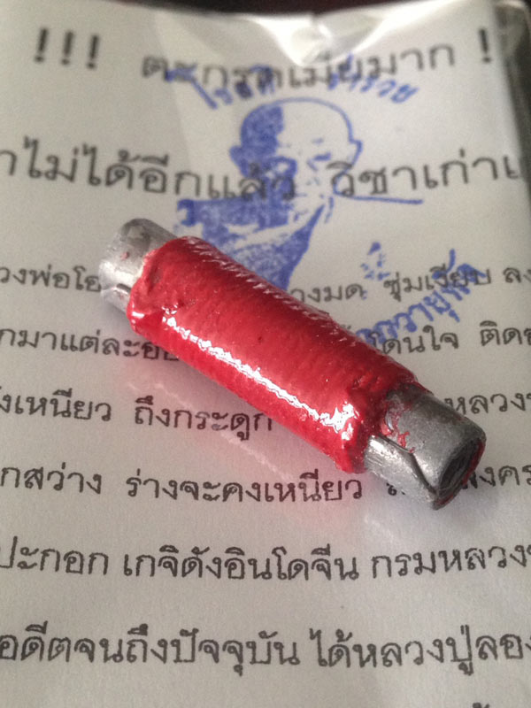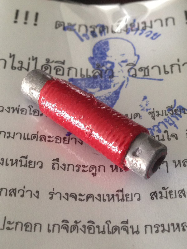 หลวงปู่ท่านถึงกับบอกว่า รุ่นนี้ "เอ้ารวยใหญ่ ลาภใหญ่ เสน่ห์ใหญ่ ครูใหญ่มาทำให้เลยนะ ลูก " หลวงปู่สร้างเป็นรุ่นแรก อย่างเต็มที่ ตะกรุดรุ่นนี้จะเด่นในเรื่องเมตตา มหาเสน่ห์มาก เพราะเจ้าตำรับตะกรุดภรรยามากสร้างเอง จะแรงขนาดไหนต้องเอาไปใช้เอง คนใช้ต้องมีศีลธรรมมีสัจจะจะใช้ขึ้นแรงเห็นผลเลย ตะกรุดเป็นตะกั่วลงหัวใจมหานิยมชั้นสูง ข้างในสำคัญมาก ท่านเอาขี้ผึ้งปิดหน้าผากที่หลวงปู่พริ้งให้มา ทาทุกแผ่น ตะกรุดนี้ เอาแค่ผิวๆ ก็เป็นเมตตาเข้าหาเจ้านาย มหานิยมมาก สำหรับผู้ที่ต้องการมีตำแหน่งหน้าที่เจริญเติบโตก้าวหน้า หรือผู้ที่มีใจด้านเสี่ยงโชคลาภ ผู้นำ ผู้บังคับบัญชา หรือนักบริหาร ข้าราชการจะมีแต่คนรักคนหนุน ตำรวจ ครูบาอาจารย์ นักพูด นักขาย นักเจรจา ดารา นักร้อง จะมีคนติดใจนิยมมาก มหาเสน่ห์ มหานิยมที่รุนแรงต่อเพศต่าง ๆ ชนะเหนือคู่แข่งขันทั้งหลาย ด้านนอกถักพันด้วยเชือกลงอาถมลงชาดแดง (มีความสุขล้น) สร้าง 300 ดอก |