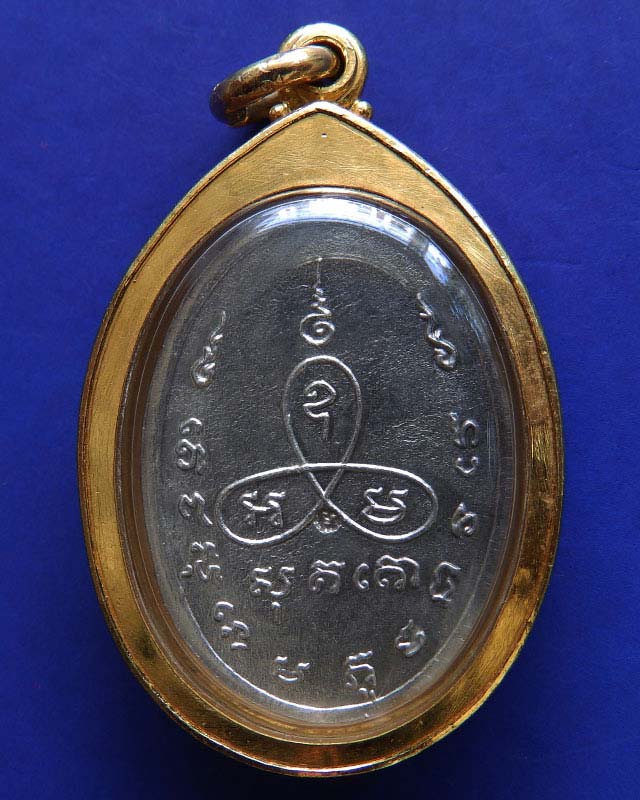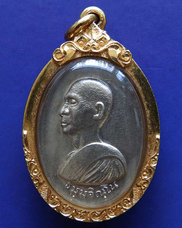 เหรียญรุ่นแรกเนื้อเงิน หลวงปู่ม่น วัดเนินตามาก จ.ชลบุรี ตอกโค้ด พ.ศ. 2517 เลี่ยมทองยกซุ้ม
