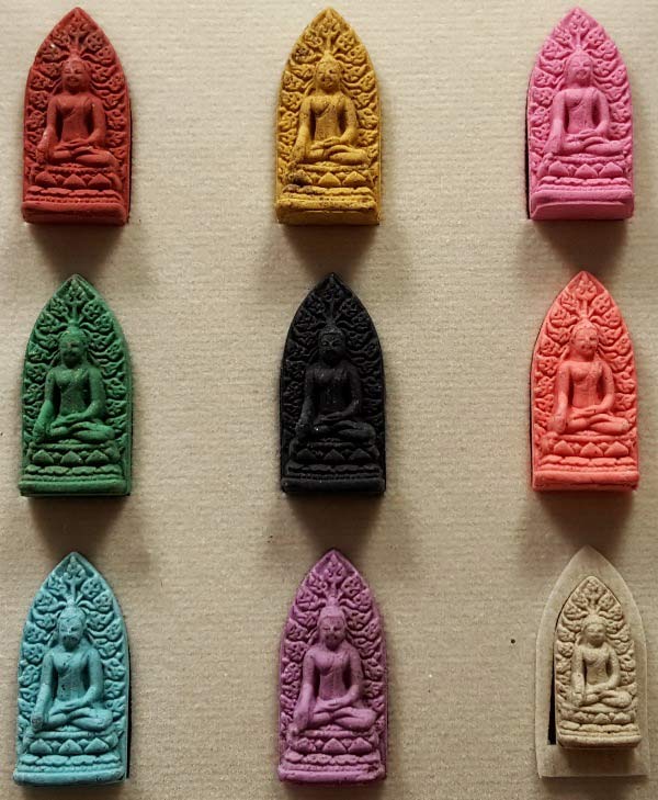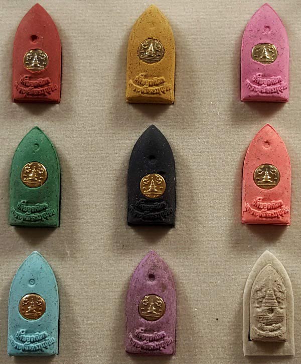 พระรอดหลวงหริภุญชัย รุ่น ปลียอดฉัตรพระธาตุเข้าหริภุญชัย ปี58 กล่องชุดนพเคราะห์เทวาธาตุ ประกอบด้วยสีประจำวันทั้ง8สีและเนื้อหอยสังข์1องค์(พิเศษ) รวมเป็น9องค์