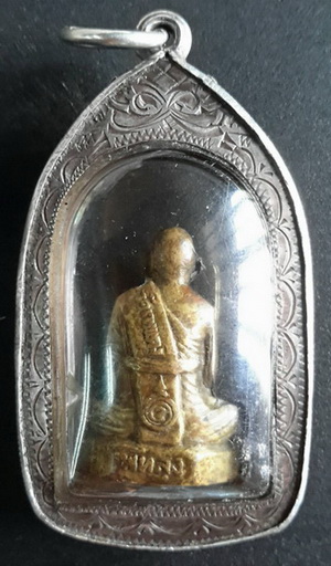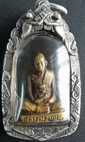 พระรูปเหมือนปั๊มรุ่นแรก หลวงพ่อหมุน วัดเขาแดงตะวันออก พัทลุง ปี 2516 พร้อมเลี่ยมเงิน สภาพใช้