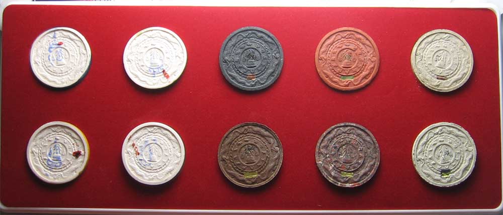 - เนื้อเคลือบสี น้ำเงิน,เหลือง,เขียว,ฟ้า ด้านหลังมียอดครั่ง และประทับหัวยันต์อุ (อุณาโลม)