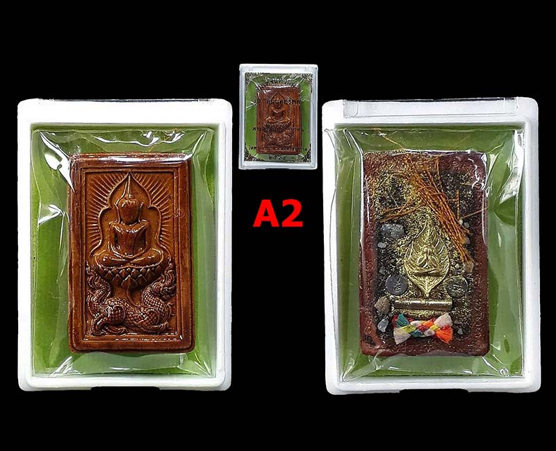 - เนื้อดินผสมผงเคลือบแชล็ค ด้านหลังอุดมวลสารผสมแร่ พร้อมพระปิดตาใบมะนาวเนื้อทองชนวน ตะกรุดเงิน 1 ดอก จีวร เกศา เม็ดพลอย ผงตะไบทอง ไหม 7 สี และเม็ดโค๊ต 2 เม็ด พร้อมกล่องครับ