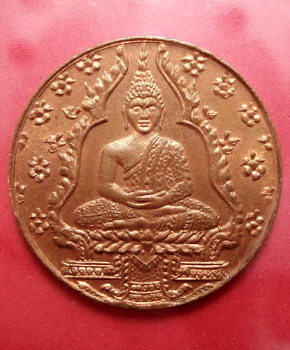 ...ลักษณะเหรียญเป็นแบบปั้มกลมแบนขอบเลียบ ด้านหน้าเหรียญ ภายในซุ้มเรือนแก้วเป็นรูป พระแก้วมรกต ประทับนั่งบนฐานบัวคว่ำบัวหงาย มีผ้าทิพย์ห้อย และดอกไม้อยู่โดยรอบ ด้านหลังเหรียญ เป็นรูปยันต์กงจักร มีอักษรจารึก มรรค ๘ อักขระขอมที่ปรากฏ คือ