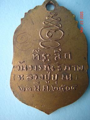 เป็นเหรียญที่สร้างในโอกาสเป็นที่ระลึกวันมรณภาพของหลวงปู่บุญ เมื่อวันที่ 23 มีนาคม ดังนั้นเหรียญรุ่นนี้อาจจะจัดเป็นเหรียญ รุ่น 2 ของหลวงปู่เพิ่มก็ว่าได้ เพราะสร้างห่างจากรุ่นแรกเพียง 2 เดือนเท่านั้น มีจำนวนการสร้างเพียง 1000 เหรียญเท่านั้นเป็นกะไหล่ทองทั้งหมด มีเหรียญเงินเพียงเล็กน้อย เหรียญนี้จัดว่ามีประสบการณ์สูง พุทธคุณเยี่ยม ส่วนใหญ่จะพบเหรียญอยู่ในสภาพที่สึกน้อยมากที่จะพบอยู่ในสภาพที่สมบรูณ์ องค์ที่มาเปิดนี้อยู่ในสภาพที่สมบรูณ์มาก เปิดราคาที่ 8500 บาทครับ สนใจติดต่อ โจ 05-0566093  |