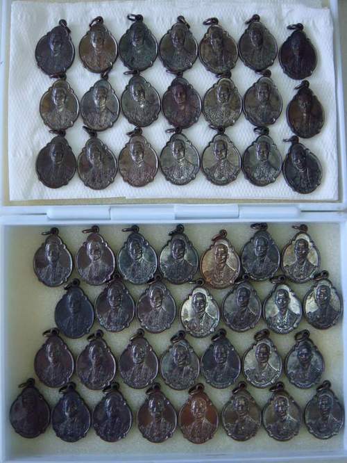 เหรียญในหลวงเฉลิมพระชนมพรรษาครบ4รอบ ปี๒๕๑๘ เนื้อทองแดงรมดำ สภาพสวยมาก ผมขอนำประวัติการสร้างเหรียญในหลวงครบ4รอบ มากล่าวไว้บางส่วนเพื่อเป็นประโยชน์แก่เพื่อนสมาชิก มูลเหตุในการจัดสร้างเหรียญพระบรมฉายาลักษณ์ เนื่องในอภิลักขิตกาลมหามงคลสมัยที่พระบาทสมเด็จพระเจ้าอยู่หัว ทรงเจริญพระชนมายุครบ 48 พรรษา สมเด็จพระอริยวงศาคตญาณ สมเด็จพระสังฆราช ได้ขอพระบรมราชาณุญาต สร้างเหรียญพระบรมฉายาลักษณ์ เพื่อทูลเกล้าฯถวาย เพื่อที่จะพระราชทานแก่ทหารตำรวจและอาสาสมัครรักษาดินแดนและประชาชนทั่วไป ทางคณะสงฆ์ได้อาราธนาพระเถราจารย์ มาร่วมประกอบพิธีชัยมังคลาภิเษก ที่พระอุโบสถวัดรพระศรีรัตนศาสดาราม กำหนดพิธีมหาฤกษ์มหามงคลตรงกับวันที่ 1 เมษายน 2520 ตรงกับวันศุกร์ ขึ้น ๓ ค่ำ เดือน๕ โดยท่านสมเด็จพระสังฆราชเป็นประธานจุดเทียนชัย พระเถราจารย์ชั้นผู้ใหญ่ 9 รูป จากวัดหลวงประจำรัชกาลทั้ง9วัด เจริญพระพุทธมนต์ พระเกจิอาจารย์49รูป ร่วมเจริญคาถานั่งปรกบริกรมมปลุกเสก ประกอบด้วย 1.สมเด็จพระญาณสังวร วัดบวรฯ 2.สมเด็จพระธีรญาณมุนี วัดจักรวรรดิราชาวาส 3.พระวิสุทธิวงศาจารย์ (สงี่ยม) วัดสุทัศน์ 4.พระธรรมศิริชัย วัดพระปฐมเจดีย์ 5.พระเทพสาครมุนี (ลพ.แก้ว) วัดช่องลม 6.พระเทพคุณาธาร (เจียม) วัดโสธรฯ 7.พระเทพวราลังการ (ลป.ศรีจันทร์) วัดเลยหลง 8.พระเทพวุฒาจารย์ (ลพ.เปลื้อง) วัดสุวรรณภูมิ 9.พระราชอุทัยกวี 10.พระราชญาณดิลก (ลพ.ชิต) วัดเขาเต่า หัวหิน 11.พระราชภัทราจาร วัดราชบพิธฯ 12.พระญาณสิทธาจารย์ 13.พระชินวงศาจารย์ (ลพ.พุธ) วัดป่าสาลวัน 14.พระวิมลกิจจารักษ์ วัดชนะสงคราม 15.ลป.โต๊ะ วัดประดู่ฉิมพลี 16.ลพ.ชา วัดหนองปาพง 17.ลป.พรหมา วัดพระบาทตากผ้า 18.ลพ.สนิท วัดศีลขันธ์ 19.ลป.ดุลย์ วัดบูรพาราม 20.ลพ.ใหญ่ วัดสะแก อยุธยา 21.ลพ.บาง วัดหนองพลับ สระบุรี 22.ลพ.เชื่อม วัดเกศไชโย อ่างทอง 23.ลพ.เส็ง วัดน้อยนางหงษ์ 24.ลพ.เที่ยง วัดม่วงชุม 25.ลพ.ผิว วัดสง่างาม 26.ครูบาอินทจักร วัดบ่อหลวง เชียงใหม่ 27.ลป.บุญ วัดวังมะนาว 28.ลพ.เชื้อ วัดใหม่บำเพ็ญบุญ 29.ลพ.แพ วัดพิกุลทอง 30.ลพ.เริ่ม วัดจุกกระเฌอ ชลบุรี 31.ลพ.ทอง วัดบ่อนอก ประจวบฯ 32.ลพ.อ่อน วัดเพียมาตร ศรีสะเกษ 33.ลพ.จ้วน วัดพระบาทเขาลูกช้าง 34.ลพ.อุตตมะ วัดวังก์วิเวการาม 35.ลพ.เนื่อง วัดจุฬามนี 36.ลพ.จ้อย วัดเขาสุวรรณประดิษฐ์ 37.ลพ.กี๋ วัดหูช้าง 38.ลพ.สิน วัดกิ่งแก้ว 39.ลพ.ท่อน วัดศรีอภัยวัน จ.เลย 40.ลพ.เฟื่อง วัดธรรมสถิต ระยอง 41.พระอาจารย์บุญมา วัดสิริสาลวัน หนองบัวลำภู 42.ลป.สาม วัดป่าไตรวิเวก 43.พระอจ.แว่น ธนปาโล วัดสุทธาวาส 44.พระอจ.บุญ วัดศรีสว่างแดนดิน 45.อจ.ผั่น วัดถ้ำเอราวัณ จ.เลย 46.พระอจ.วัน อุตตโม วัด