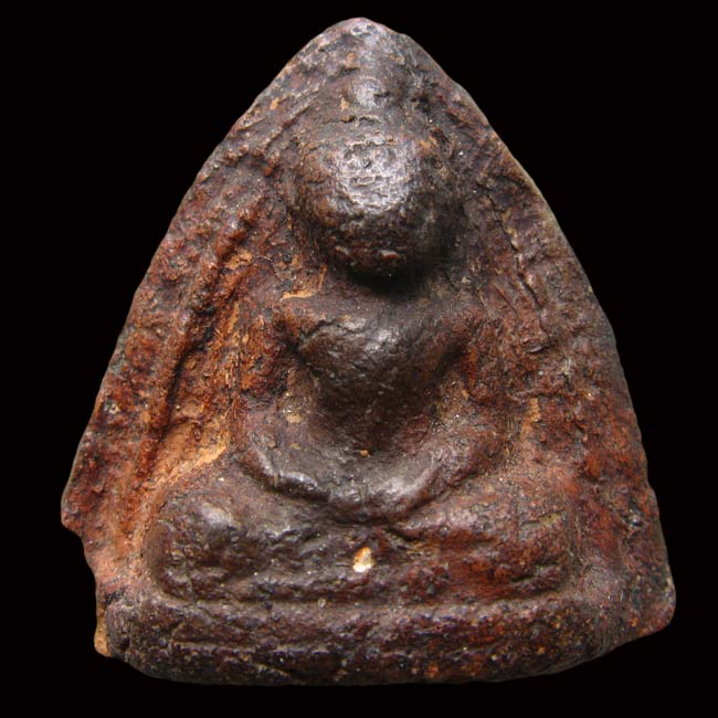 องค์นี้ ลงรักน้ำเกลี้ยง เนื้อแห้งเก่าจัด แต่มีบิ่นตรงมุมขวาขององค์พระด้านล่าง คิดว่ามีการพิสูจน์ความเก๊ ความแท้แบบผิดวิธี ของนักเล่นพระรุ่นเก่าโดยใช้วิธีการหักเพื่อดูเนื้อพระข้างใน และพบว่า เนื้อในเป็นสีดำหุ้มด้วยเนื้อสีแดง เหมือนสอดใส้สีดำ แท้แน่นอน นับว่าจะหาชมกันได้ยาก |