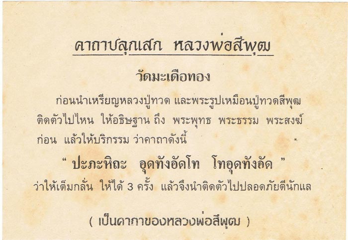 ยิงไม่ออก กับ หลวงพ่อสีพุฒ วัดมะเดือทอง จ.ปัตตานี เนื้อทองเหลืองอุดผง ปี 38 อ.นอง หลวงปู่แดง วัดศรีมหาโพธ์ อ.ทอง ท่านเขียววัดห้วยเงาะ และเกจิอีกหลายรูป เหตุเกิดที อ.ยะหา จ.ยะลา เมื่อต้นเดือน ทหารปะทะกัน ฝ่ยผู้ก่อการร้าย ยิงไม่ออกแม้แต่นัดเดียว เลย ทำให้ทหารได้แห่กันมาที่วัดสามคันรถ เพื่อมาหาพระเครื่องชุดนี้ ตอนนี้ในพื้นที่เป็นที่ต้องการของชาวบ้านมากครับ หลวงพ่อศรีพุฒเป็น เกจิสายเขาอ้อ เสียเมื่อปี 248.กว่าครับ เป็น อ.ของหลวงปู่แดง วัดศรีมหาโพธ์ |