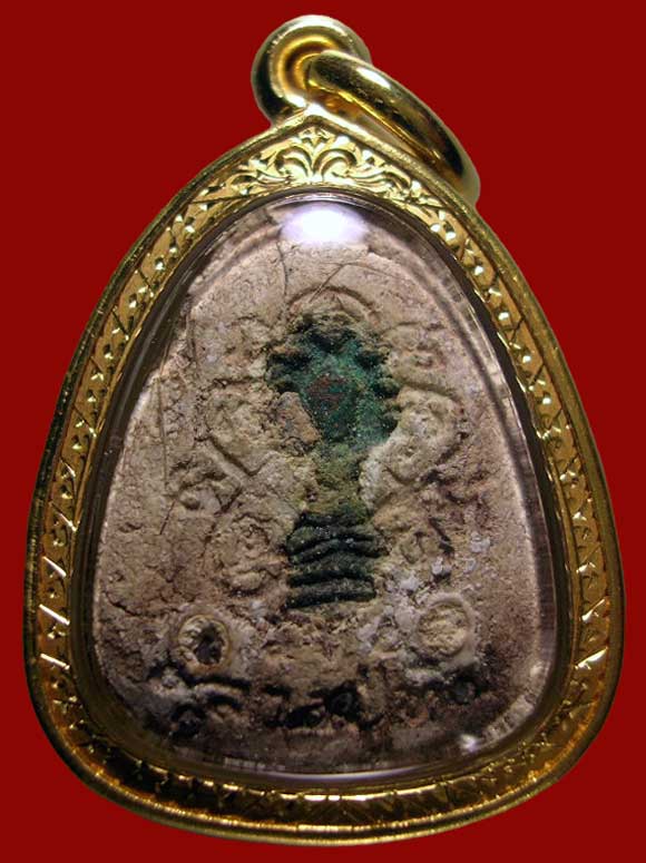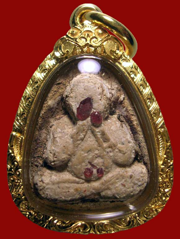 ปกติปิดตาฝังทับทิมหลังยันต์ห้า ปลุกเสกโดย ลป.ทิมแห่งวัดละหารไร่ ด้านหลังฝังพระนาคปรกของ ลป.แหวน ที่อาจารย์เจือแห่งวัดปากน้ำสร้างถวาย ลป.ทิมนั้น จะจัดสร้างเพียง 100 องค์ แต่สำหรับองค์นี้ น่าจะเป็นองค์เดียวในโลกเท่าที่เคยพบเห็น ได้ทั้งเส้นเกษาที่มาเป็นกระจุก ได้ทั้งเนื้อหาผงพรายกุมารที่เข้มข้น ได้พลอยเสกของ ลป.ทิม และนาคปรก ลป.แหวน