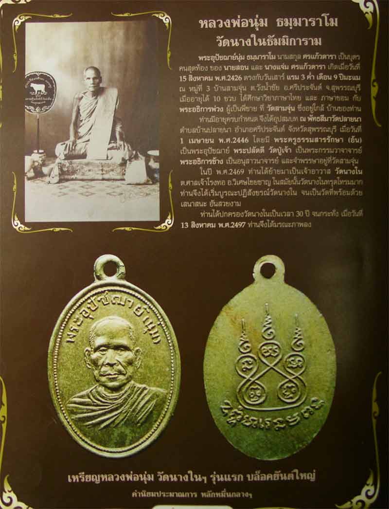 ...เกจิที่เป็นมิกสหายทางธรรมกับหลวงพ่อเดิม เวลาท่านเดินธุดงน์ไปแถวนครสวรรค์ ท่านจะแวะเวียนไปเยี่ยมลพ.เดิม ขากลับลพ.เดิม จะให้ช้างมาส่งลพ.นุ่ม ถึงอ่างทอง วัตถุมงคลของลพ.เดิม ที่ชาววิเศษชัยชาญมีกันมาก ก็เพราะเวลาช้างมาส่ง ลพ.นุ่ม ลพ.เดิมท่านจะมอบวัตถุมงคล ให้กับลพ.นุ่ม นำให้ชาวอ่างทองติดมาเสมอๆครับ..... |
