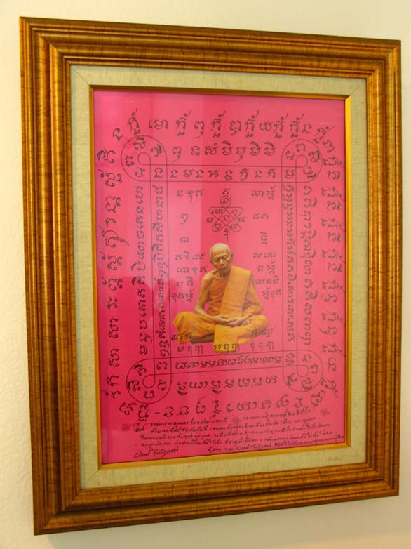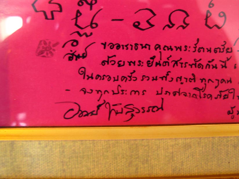 เหลือเก็บไว้เพียงเท่านี้ครับ สำหรับสิ่งบูชาของหลวงปู่ทิม วัดละหารไร่ เพราะชิ้นอื่นๆไปอยู่กับเจ้าของตัวจริงหมดแล้ว . . . ชิ้นแรกเป็นกระดาษสารพัดกันที่เคยนำมาลงโชว์บ้างแล้ว ชิ้นนี้มีดีตรงที่ลายเซ็นของ อาจารย์อารมณ์ ทับสุวรรณ และโค๊ตส่วนตัวของท่าน ส่วนอีกชิ้นหนึ่งเป็นผ้ายันต์สารพัดกันผืนสีแดง สภาพเดิมมากๆ ชิ้นนี้พี่อู๊ดไร่วารีแบ่งมาให้นานพอสมควรแล้ว ซึ่งนำไปเข้ากรอบกระจกเรียบร้อยแล้ว ว่างๆเลยนำมาให้เพื่อนๆพี่ๆได้ชมกันครับ.......ชิ้นแรก กระดาษสารพัดกันสีชมพูสวยสด สภาพเต็ม100%ครับ |