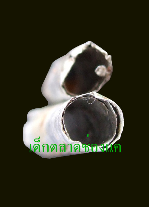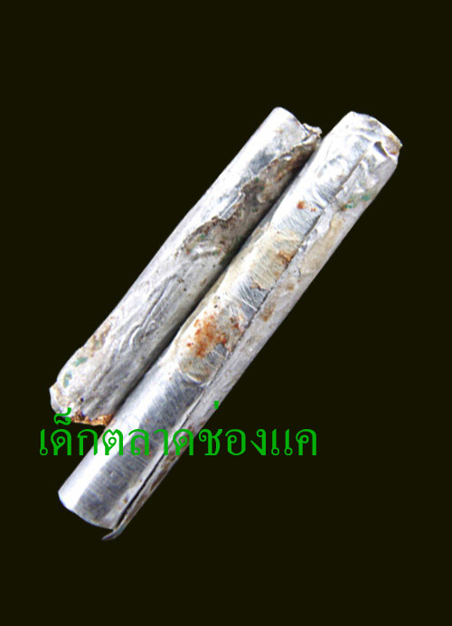 ตะกรุดสองดอกนี้ เป็นตะกรุดฝารองในไมโล (หรือโอวัลตินไม่รู้) คือนึกถึงฝารองในกระป๋องนะครบ จะเป็นฟอลย์บางๆ เบาๆ คนละอย่างกับอลูมิเนียมหรือบอกคนเรียกว่าฝาบาตรนะครับ ตะกรุดฝารองในไมโล ที่เรียกอย่างนั้น เพราะเอาฝาในของกระป๋องไมโล โอวัลตินมาทำ แล้วแต่ใครจะเรียกว่าไมโลหรือโอวัลติน ส่วนผมติดปากจะเรียกว่าฝาไมโล ข้อสังเกตอีกอย่าง ตะกรุดนี้ ขอบจะไม่เรียบร้อยหรือคมนะครับเพราะหลวงพ่อเอามีฉีกฝาออกมาเขียน และที่สำคัญ ต้องเบา ลอยน้ำได้ เปิดพัดลมเบอร์ 1 ก็ปลิวแล้วครับ เช่าหาก็ระวังกันหน่อยเน้อ สองดอกนี้มีขนาด 1 นิ้วนะครับ |