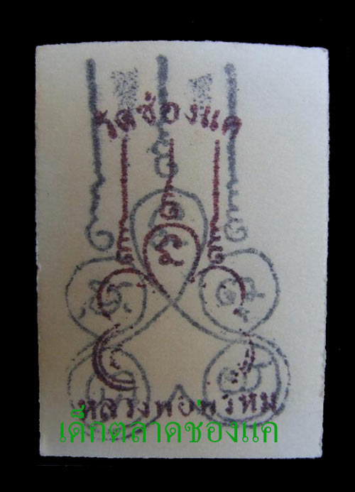 ด้านหลังเป็นรอยยันต์ปั๊ม 5 ใหญ่ กับ และซ้อนทับด้วยยันต์ห้าเล็ก บนวัดโค้ง เข้าใจว่า คงจะเอามาปั๊มในช่วงปี 2513-2515 นะครับ เพราะของหลวงพ่อตอนออกบูชาที่วัดจะไม่มีการปั๊มยันต์ก่อนเข้าพิธี จะนำมาปั๊มกันที่หลัง เพราะสมัยก่อนเขาจะไม่ค่อยสนใจ หรือซีเรียสเรื่องยันต์เท่าไร วางไว้ในตู้บนศาลาธรรมดา ขนาดยุดอาจารย์แบ๊งหลังหลวงพ่อมรณะภาพ บนศาลาหลังใหม่(ปัจจุบัน) ก็ยังวางไว้ธรรมดา ใครเช่าวัตถุมงคลของหลวงพ่ออยากปั๊มตรายางก็ปั๊มไป ผมไม่อยากให้เข้าใจผิดว่า ปั๊มตรายาก่อนเข้าพิธีครับ |