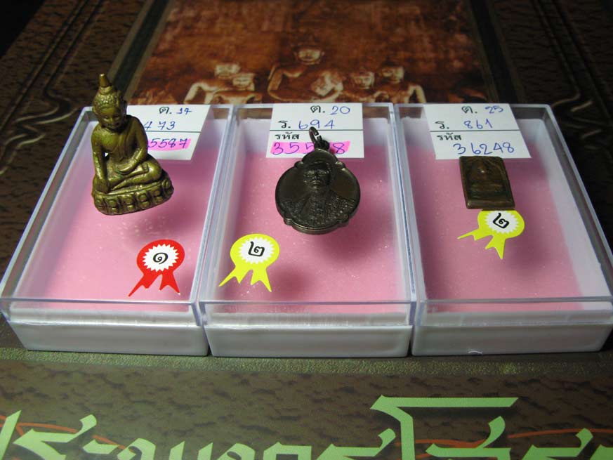 ตั้งใจว่าจะไปเอาหนังสือมาเพิ่มอีกเล่ม เพื่อไว้ดูภาพพระสวยๆ ยิ่งเป็นรวมภาพพระหลวงพ่อโสธรยิ่งตั้งใจมากขึ้น เพราะมีเก็บไว้กับเค้าอยู่บ้าง ไม่ติดรางวัลก็กะจะซื้อกลับบ้านแน่ๆ ... ติดพระไปสามองค์ องค์แรกเป็นพระกริ่ง๗รอบ ปี2499 วัดบวรฯ องค์นี้ตั้งใจให้ได้โบว์แดงแล้วก็จะเลี่ยมกันน้ำใส่ตลับทองเก็บยาวแล้ว(สั่งทำตลับรอไว้เรียบร้อย ด้วยความอนุเคราะห์ของพี่w_peenoom ขอบคุณมา ณ ที่นี้ครับพี่) ... องค์ที่สอง เป็นเหรียญสี่รอบในหลวง เนื้อทองแดงรมดำ ... องค์ที่สาม พระหลวงปู่ศุข หลังยันต์นูน วัดปากคลองมะขามเฒ่า ตอนแรกกะว่าจะเอาไปให้ร้านเลี่ยมใส่กรอบ เพราะตอนนี้แกะออกมาจากเลี่ยม บังเอิญเพื่อนเหลือบัตรเลยเอาไปส่งด้วย ... ผลงานก็ตามภาพที่เห็นครับ หนึ่งโบว์แดงกับกริ่ง๗รอบ2499 และ สองโบว์เหลืองกับเหรียญสี่รอบในหลวง และพระหลวงปู่ศุข พิมพ์หลังยันต์นูน ... ฝากถึงพี่w_peenoomครับว่า สงสัยจะต้องorderตลับเพิ่มกับพระหลวงศุขแล้วละครับพี่  |