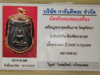 เหรียญเสมา พระพุทธชินราชอินโดจีน ปี 2485 เหรียญนี้ ผมบูชา มาจาก "คุณเอก...." พร้อมเลี่ยมทองกันน้ำแล้ว เมื่อเดือนพฎษภาคม ปี 2545 ในราคา 6,000 บาท ... ตอนนั้นก็ว่าแพง แต่เห็นว่าสวยก็บูชามา .... ขึ้นคอบ้าง เก็บเข้าเซพบ้าง ... ได้ใบเซอร์ จากสมาคมฯ ปี 2547 .... อาทิตย์ที่แล้วนึกครึ้มใจ นำไปออกบัตรรับรองจาก G-PRA ... ก็ไม่ผิดหวัง ได้ "สภาพสวย" ครับ ปลื้มใจมาก ขออนุญาตโชวอย่างเดียว ไม่มีเจตนาเสนอขาย ครับผม  |