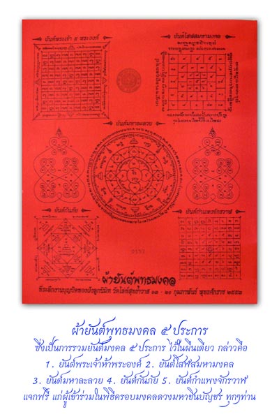 พิเศษสำหรับผู้เข้าร่วมในพิธีจะได้รับผ้ายันต์พุทธมงคล มหายันต์ รุ่นแรก ซึ่งเป็นการรวมยันต์มงคล 5 ประการ ไว้ในผืนเดียว กล่าวคือ 1.ยันต์พระเจ้าห้าพระองค์ 2.ยันต์โสฬสมหามงคล 3.ยันต์มหาละลวย 4.ยันต์กันภัย 5.ยันต์กำแพงจักรวาล (ขนาดผ้ายันต์ 10x12 นิ้ว) แจกฟรีแก่ทุกท่านที่เข้าร่วมในพิธีเพื่อเป็นพุทธานุสติ และเป็นสิริมงคล ด้วยความตั้งใจของผู้สร้าง เพื่อให้วัตถุมงคล ผ้ายันต์พุทธมงคลมหายันต์ รุ่นแรกรุ่นนี้เป็นสิ่งยึดเหนี่ยวจิตใจ เป็นพุทธานุสติ อันเป็นแนวทางน้อมนำไปสู่หลักธรรมคำสั่งสอนขององค์พระสัมมาสัมพุทธเจ้า องค์พระศาสดา และสืบทอดพระพุทธศาสนาโดยการสร้างไว้ให้อนุชนรุ่นหลังได้สักการบูชาเป็นสิริมงคลต่อไป