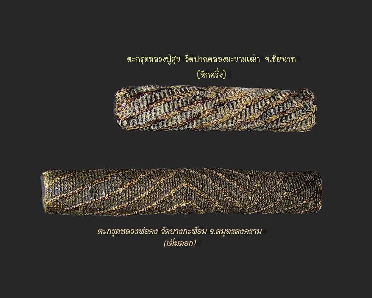 บน - เป็นตะะกรุดของหลวงปู่ศุข วัดปากคลองมะขามเฒ่า จ.ชัยนาท ครับ ขอให้สังเกตลายถักให้ดีครับ ไม่ค่อยได้พบเห็นนะครับ สำหรับดอกนี้มีแค่ครึ่งเดียวครับ
