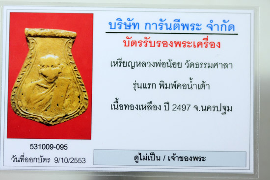 พระเหรียญหล่อหลวงพ่อน้อย วัดธรรมศาลา รุ่นแรก พิมพ์คอน้ำเต้า พระรุ่นแรกนั้นไม่ว่าพระพิมพ์หน้าเสือหรือพระพิมพ์คอน้ำเต้าเป็นพระที่มีประสบการณ์สูงและหาตัวจริงยากมาก พระองค์ในรูปเป็นพระสภาพปานกลาง ได้ที่ดูง่าย แถมมีดีกรีบัตรรับรองการันตีพระพ่วงท้าย ท่านใดชอบสะสมสายนี้เชิญที่หน้าประมูลเลยครับ พระแบบนี้หาไม่ง่าย แถมที่ออก"บัตรจีพระ"ได้ยิ่งหายากเป็นเท่าทวีคูณ |