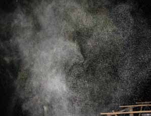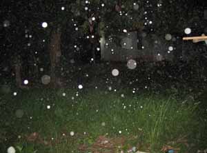 ถ่ายตอนกลางคืน ประมาณ 2 ทุ่ม ใช้แฟลช ทดลองด้วยการนำแป้งฝุ่นโยนขึ้นไปในอากาศ แล้วถ่ายรูปตามทันที ได้เป็นภาพที่ 1 จากนั้นรอแป้งกระจายตกลงพื้นจึงถ่ายตามจึงได้รูปที่2...เท่าที่ผมทราบตัว ccd และแสงแฟลช จากกล้องคอมแพ็คดิจิตอล จะมีปัญหาเวลาจับภาพที่มีอนุภาคเล็กๆ เช่น ฝุ่น ผงแป้ง ตัวแมลงเล็กที่บังเอิญบินผ่านเข้ามา หรือแม้แต่ใยแมงมุมก็จะทำให้ได้ภาพที่ผิดเพี้ยนไปได้เหมือนกัน |