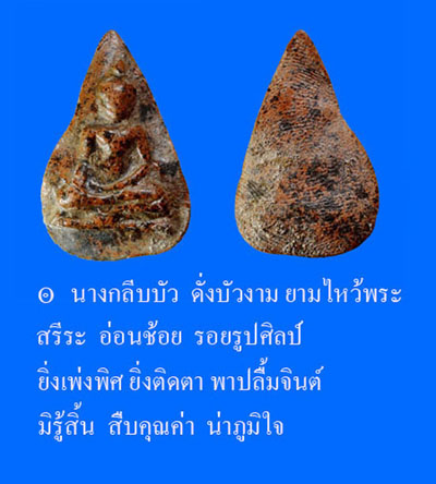 สถิตย์อยู่บนพื้นฐานดินเผารูปนางกลีบบัว เนื้อละเอียดนุ่ม มีว่านดอกมะขามและคราบรารักจับแน่น