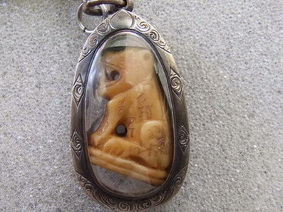 อยู่ว่างๆเลยถ่ายรูปให้ดูครับ ช่วงนั้นเข้าออกวัดสุทัศน์บ่อยๆ เป็นเขี้ยวหมีแกะครับ ลป.เสกให้อีกโดยใช้หัวนิ้วโป้งแตะที่เพดานปากแล้วคลึงที่ตัวเสือ คลาบน้ำมันเสือแห้งหมดแล้วครับ เสือตัวนี้ผมเอาขนเสือใส่ลงไปด้วย หายากแล้วครับ  |