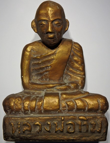 พระบูชาองค์นี้เป็นพระบูชาปูนปั้น รุ่นสอง ตัวหนังสือนูน หรือที่เขาเรียกกันว่าหน้า"กาโม่" ลูกศิษย์ที่ศรัทธาในองค์หลวงปู่ทิม จึงได้ขออนุญาต หลวงปู่ทิม ท่านสร้างด้วยปูนผสมผง แกนกลางทำด้วยไม้ไผ่ จัดสร้างคราวล่ะไม่มาก เมื่อหล่อเสร็จ ก็เจาะใต้ฐานไว้ จึงนำถวายให้หลวงปู่ทิม เมตตาบรรจุผงพุทธคุณต่างๆ ตามตำรับของท่าน และของสำคัญที่ขาดไม่ได้นั่นก็คือ ผงพรายกุมาร น้ำมันพระเจ้าตาก และใบโพธิ์ตะวันออก แล้วจึงปิดทับด้วยปูนอีกทีครับ ก่อนที่จะนำไปลงรักและทาบรอนท์ทองอีกชั้น หลวงปู่ทิม ท่านเมตตาปลุกเสกเดี่ยว ก่อนจะนำออกแจกจ่ายให้ ญาติโยมที่ต้องการนำกลับไปบูชา กาลต่อมาในปี ๒๕๑๗ จึงได้มีการสร้างพระบูชาด้วยเนื้อโลหะ ซึ่งมีความสวย คมชัด กว่า การสร้างพระบูชาปูนปั้น จึงได้ยุติลง พระบูชาองค์นี้มีขนาดหน้าตัก ๕ นิ้ว สวยเดิม สุดๆ บรอนท์ทองงามมากๆ เก่าถึงยุคดูแล้วคลาสสิคครับ |