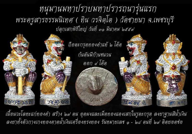 (สถานะ โชว์สวย ๆ) ข้อมูลจาก (รุ่นใหญ่ สายตรง) คุณ Bundit Kengthong ได้ให้ทัศนะเกี่ยวกับหนุมานรุ่นนี้ว่า "โดยส่วนตัวแล้วผมว่าสุดๆนะครับ อย่างแรกคือเป็นหนุมานวโลหะ รุ่นแรก ของท่านพระอาจารย์ทิน วรจิตฺโต วัดชายนา (เพชรบุรี) ปลุกเสกโดยท่านอาจารย์ทิน และพระเกจิอาจารย์ที่เป็นสายตรงวิชาของลพ.ดิ่งวัดบางวัว คือ ลพ.อนันต์ วัดบางพลีน้อย และพระเกจิสายนครปฐมและลุ่มน้ำแม่กลอง ซึ่งในแต่ละท่านแต่ละองค์ จะมีความเชี่ยวชาญเรื่องการเสกหนุมานอยู่แล้ว เช่นลพ.อวยพร วัดดอนยายหอม พระอาจารย์ใจ วัดพระยาญาติ ลพ.อิฏฐ์ วัดจุฬามณี พระมหาสุรศักดิ์ วัดประดู่ ลพ.พร ปภากโร วัดบางแก้ว ซึ่งแต่ละองค์ก็ได้รับการถ่ายทอดเรื่องการเสกหนุมานจากเกจิยุคเก่าเช่นวิชามหาปราบของหลวงพ่อคงวัดบางกระพร้อม *ผมจึงบอกได้ว่ารุ่นนี้สุดๆจริงๆ* |