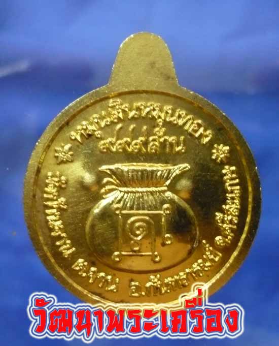 เหรียญ"หมุนเงินหมุนทอง พ.ส.2543 ถือว่าเป็นเหรียญรุ่น 2 ของท่าน เหรียญนี้พิเศษ เนื้อทองคำ นน. 19.2 กรับ ราคาจองจากวัด 9,000 บาท ตอก 2 โค๊ด จารโดยหลวงปุ่หมุน ทั้งลงเหล็กจาร และจาร สีแดงเมจิ จำนวนสร้าง 19 เหรียญ |